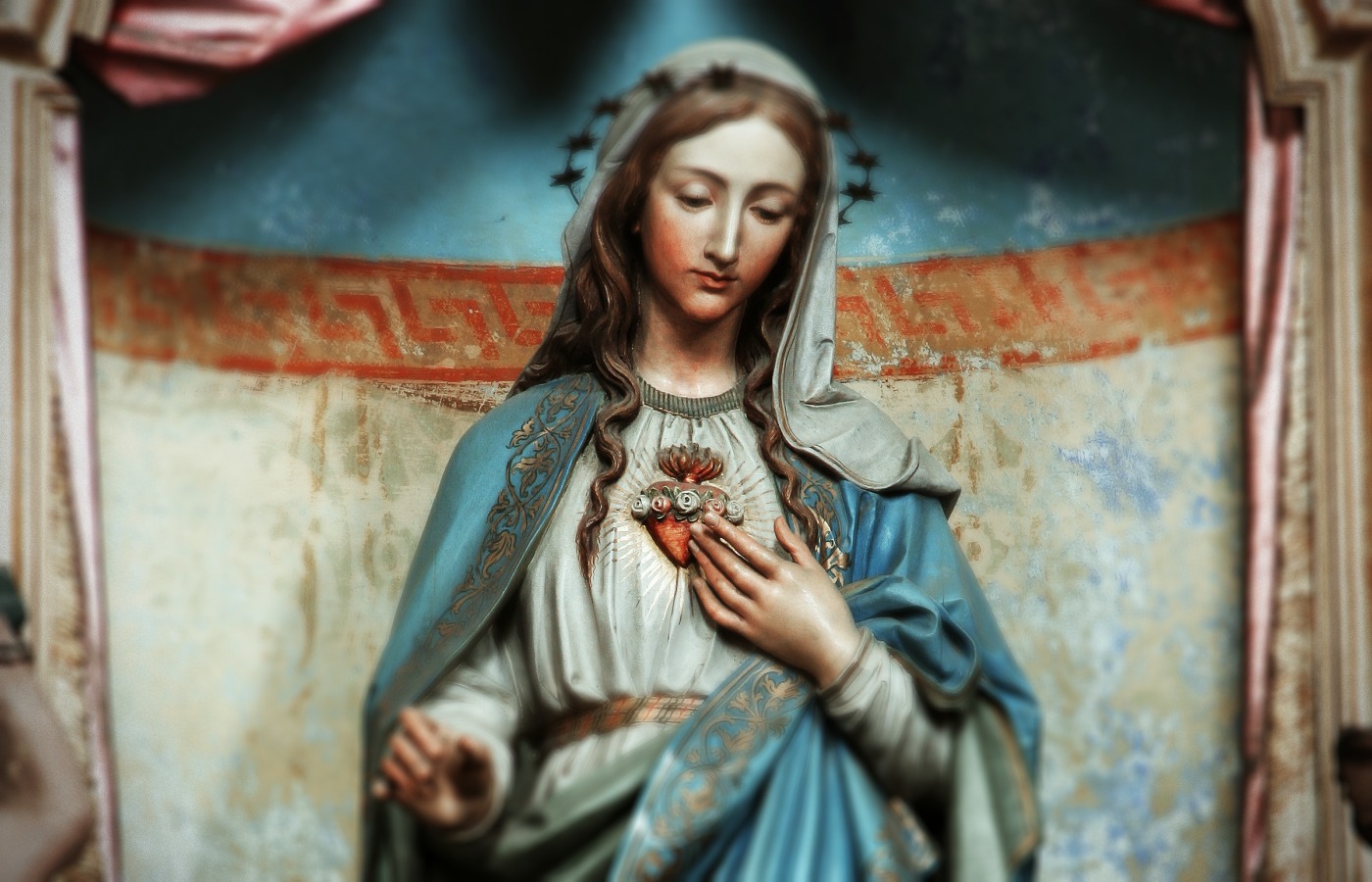 This afternoon, the Virgin Mary appeared all dressed in white; the mantle wrapped around her was white as well, and the same mantle also covered her head. On her head, Mother had a crown of twelve shining stars, her hands were clasped in prayer, and in her hands she was holding a long holy rosary, white as if made of light, which went down almost to her feet. Her feet were bare and were placed on the globe. The globe was shrouded in a great gray cloud, and a part of the world was completely dark. The Virgin Mary lowered her gaze and covered part of the world with her mantle. (in particular, she the part of the world that was dark.)